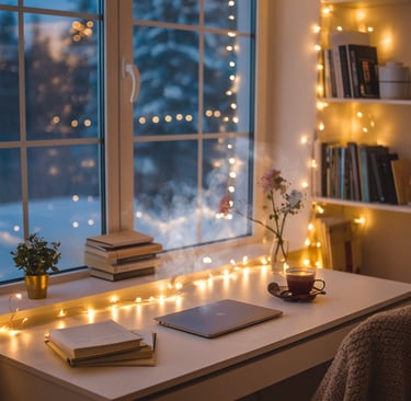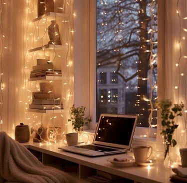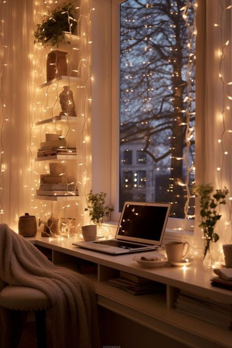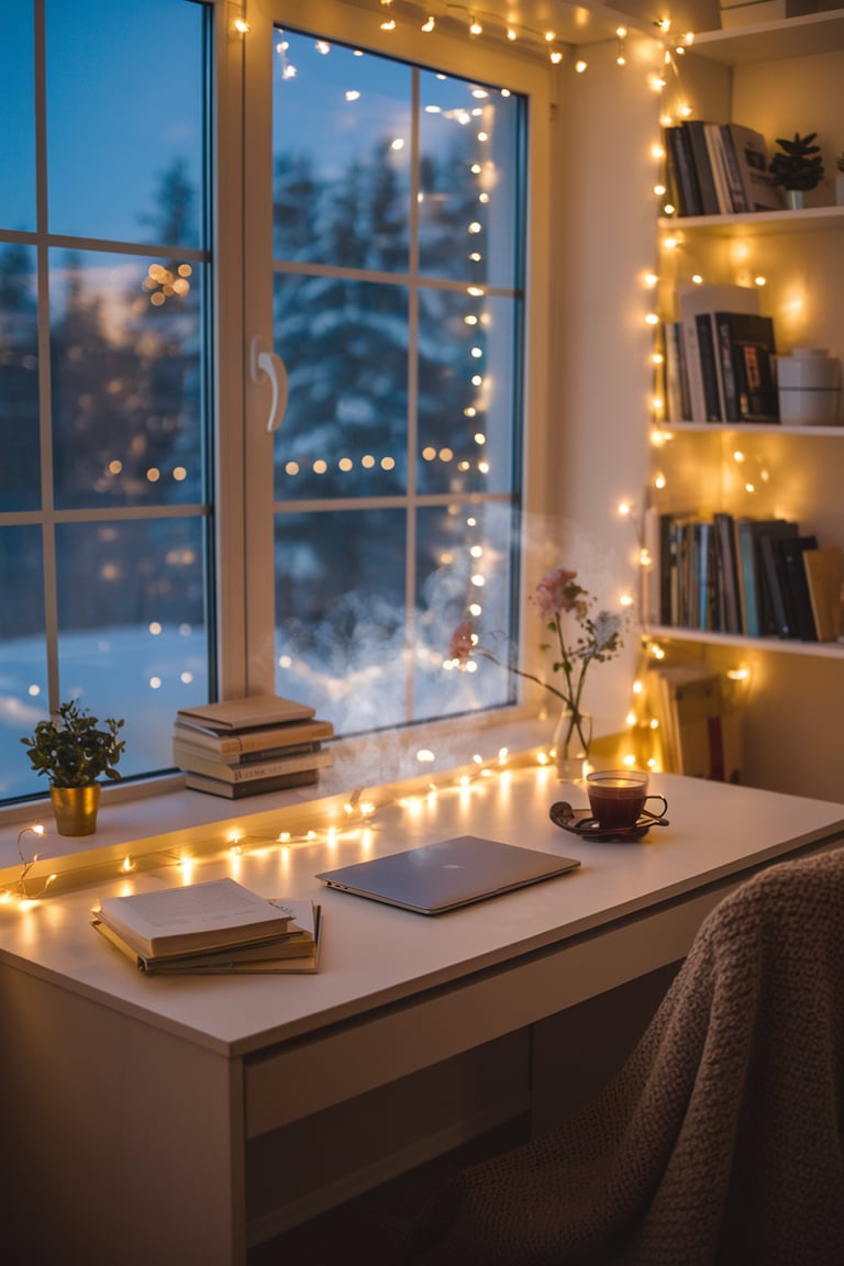 Natural light is a game-changer for creating a warm and inviting atmosphere. If possible, place your desk near a window to let the daylight pour in during the day and enjoy cozy views in the evening. In the space shown, large windows frame a serene outdoor view while soft string lights provide warmth and ambiance after the sun sets. Natural light not only brightens the area but also makes it feel open and refreshing. You can also opt for sticker light catchers, or the ones that look like crystals which filter the light into beautiful rainbows. Of course this won't work in the night time, but you can get some other type of light to create a cozy atmosphere.