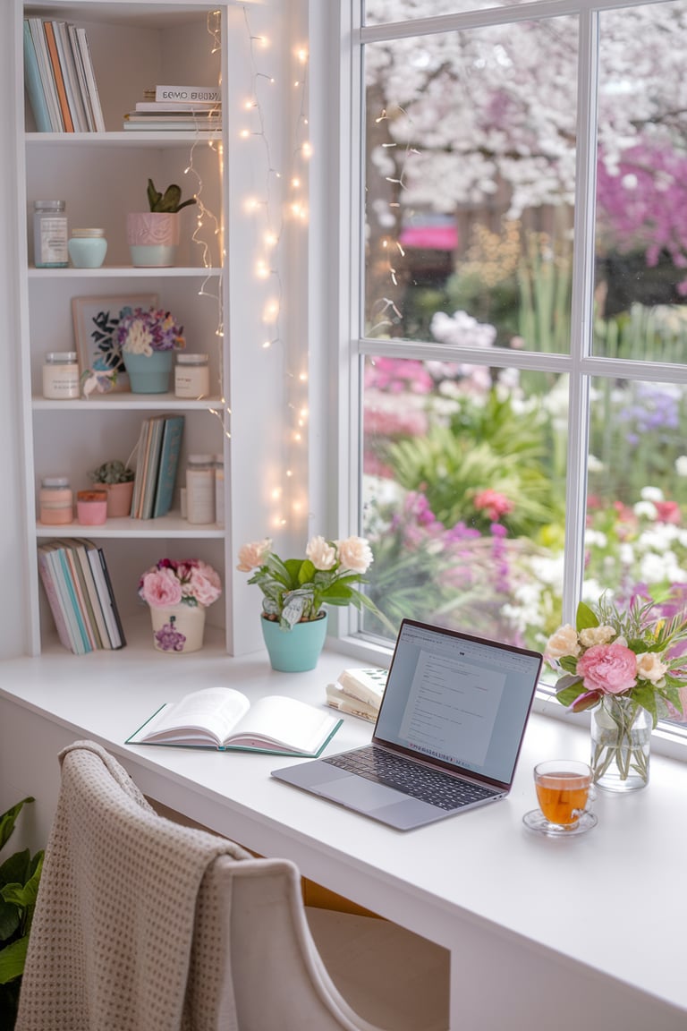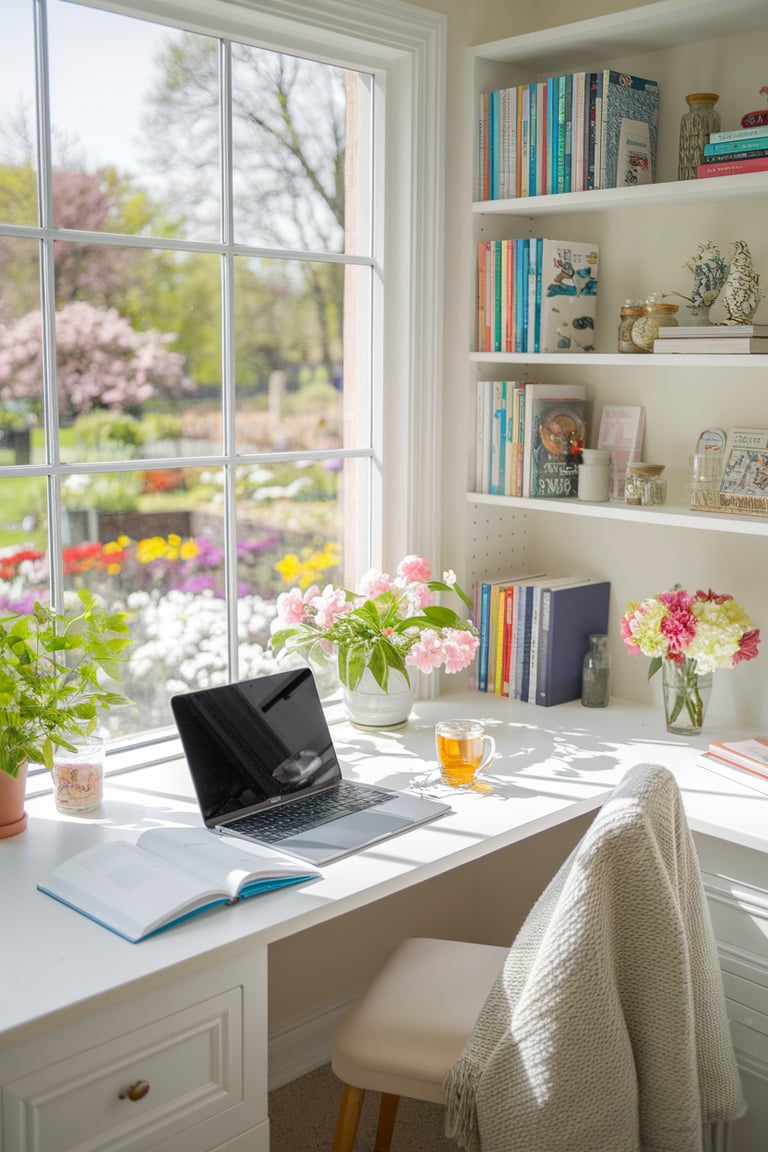 Adding a touch of greenery is an easy way to breathe life into your workspace. In this setup, small potted plants and delicate floral arrangements are placed on the desk and nearby shelves. Choose low-maintenance plants like pothos, succulents, or dried flowers if you’re not a green thumb. Not only do plants add visual interest, but they also create a calming atmosphere.